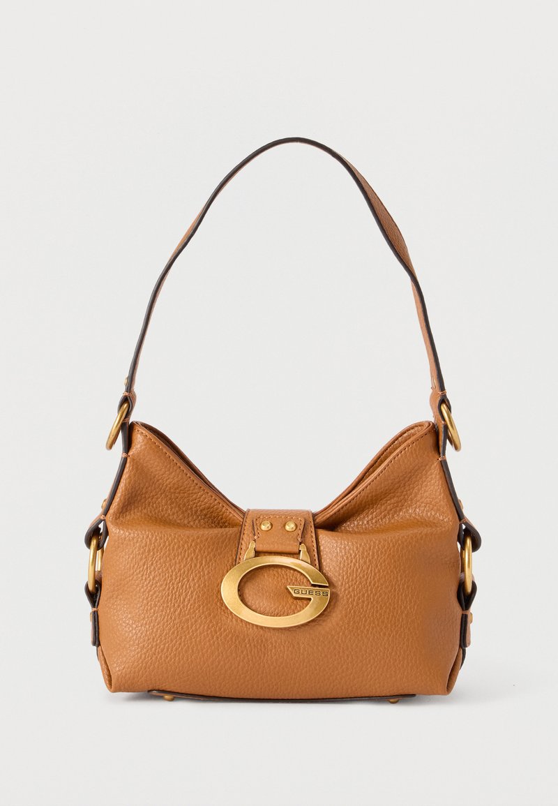 Καφέ δερμάτινη τσάντα ώμου με υφή, με έναν ενιαίο ιμάντα και μεγάλο οβάλ χρυσό αγκράφα που φέρει το λογότυπο Guess στο μπροστινό μέρος.