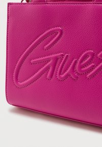 Φωτεινή ροζ τσάντα Guess με διπλές λαβές στο πάνω μέρος, αποσπώμενο ιμάντα ώμου και ανάγλυφο λογότυπο μπροστά, σε μονόχρωμο φόντο.