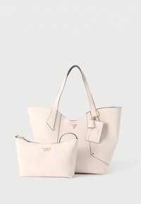 Τσάντα χειρός Guess σε μπεζ χρώμα με ταιριαστό φερμουάρ τσαντάκι, διακοσμημένη με χρυσές λογότυπες λεπτομέρειες και μια μικρή προσαρτημένη ετικέτα στη λαβή της τσάντας.