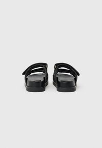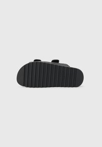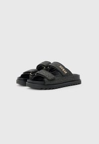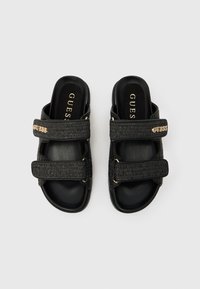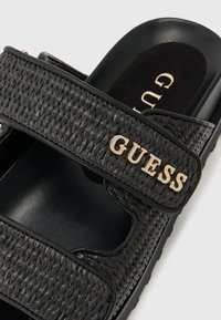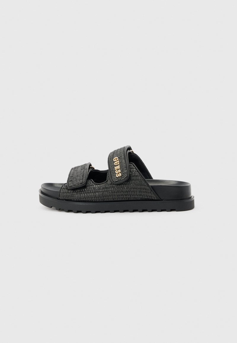 Μαύρο σανδάλι slide με υφασμένους ιμάντες, δύο ρυθμιζόμενες κλειδαριές Velcro και χρυσό λογότυπο "GUESS" στον άνω ιμάντα, επίπεδη σόλα με σχέδιο πάτου.
