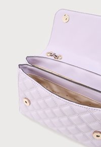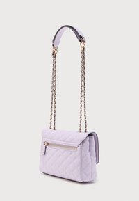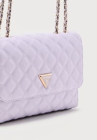 Λιλά καπιτονέ τσάντα χειρός με ασημένιο αλυσίδα λουρί και τριγωνικό λογότυπο Guess στην εμπρόσθια πτέρυγα, εκτεθειμένη σε ουδέτερο φόντο.