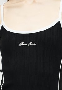Νεαρή γυναίκα με μακριά καστανά μαλλιά, ντυμένη με εφαρμοστό μαύρο μίνι φόρεμα με λευκή διακόσμηση και λογότυπο "Guess Jeans" στο στήθος.