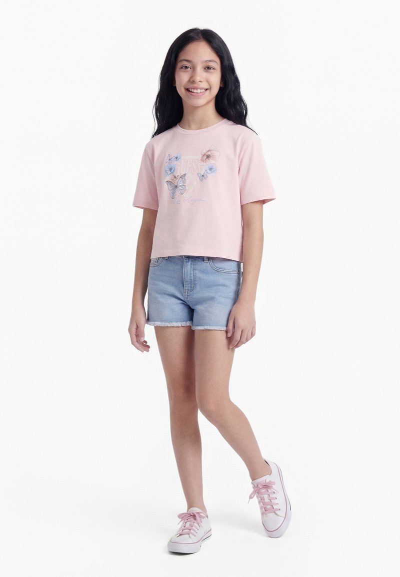 Νεαρή κοπέλα με μακριά μαύρα μαλλιά, φορώντας ροζ μπλουζάκι με τύπωμα πεταλούδων, ανοιχτό μπλε τζιν σορτς και ροζ αθλητικά παπούτσια, στέκεται σε λευκό φόντο.