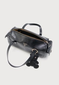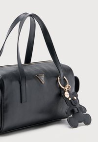Μαύρη κυλινδρική τσάντα χειρός από δέρμα με διπλές λαβές, αποσπώμενο ιμάντα ώμου, λογότυπο Guess και μπρελόκ αρκουδάκι κουκλάκι συνδεδεμένο.
