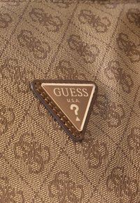 Καφέ τσάντα ώμου με σχέδιο, διπλά χερούλια, μπροστινό τριγωνικό λογότυπο και προσαρτημένη ορθογώνια ετικέτα που γράφει "GUESS" σε απλό φόντο.