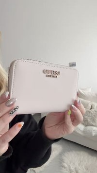 Μπεζ πορτοφόλι με φερμουάρ γύρω-γύρω από λείο υλικό, με χρυσό λογότυπο της μάρκας «GUESS EST 1981» και ραμμένες λεπτομέρειες.