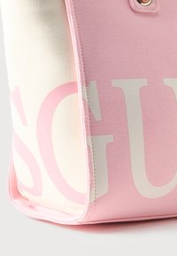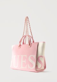 Ροζ και λευκή τσάντα ώμου με χρυσή αλυσίδα και υφασμάτινα χερούλια, με μεγάλο λευκό γράμμα "GUESS" μπροστά.