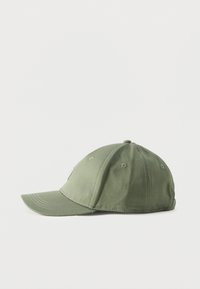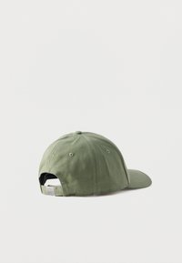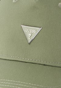 Καπέλο baseball σε ελιά πράσινο με κυρτή γείσα και τριγωνικό μεταλλικό λογότυπο Guess στο μπροστινό μέρος, απεικονισμένο σε απλό λευκό φόντο.