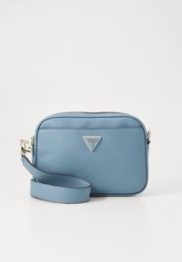 Μπλε δερμάτινη τσάντα χιαστί με λεία υφή και λεπτομέρεια λογοτύπου. Συνδυασμένη με μια ριμπ μαύρη φόρεμα και φαρδύ φουστάνι.