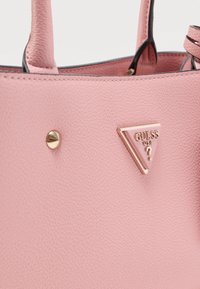 Ροζ δερμάτινη τσάντα Guess με διπλό λουράκι, τριγωνικό λογότυπο στο εμπρόσθιο μέρος και προσαρτημένη ετικέτα με χρυσής απόχρωσης μεταλλικά εξαρτήματα σε ανοιχτό φόντο.