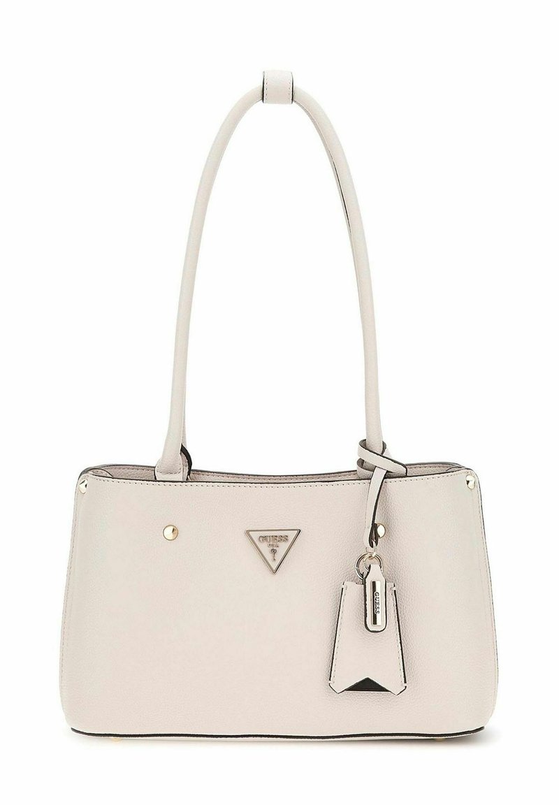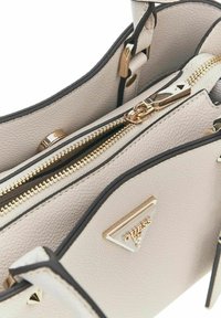 Τσάντα χειρός από ανοιχτό γκρι δέρμα με δομημένο σχήμα, διπλές επάνω λαβές, τρίγωνο λογότυπο και αποσπώμενη ετικέτα. Λεπτομέρειες από χρυσούς μεταλλικούς τόνους.