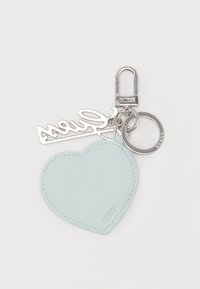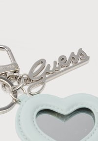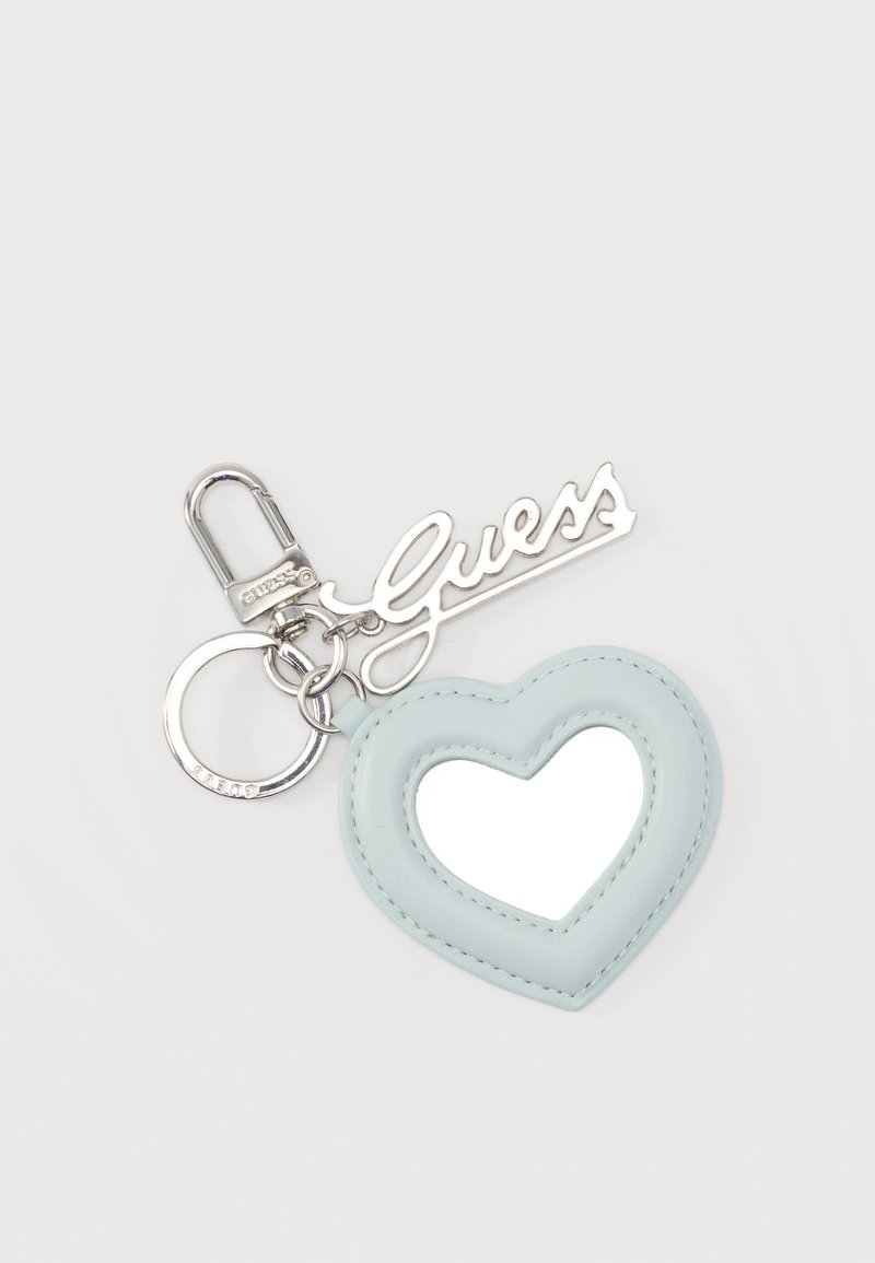 Ασημένιο μπρελόκ με μπλε καρδιά-πλαίσιο που κρατάει έναν καθρέφτη και ένα ασημένιο μενταγιόν με το λογότυπο "Guess", το οποίο είναι προσαρτημένο σε ένα κρίκο και κλείστρο.