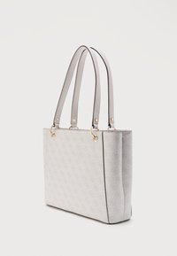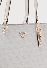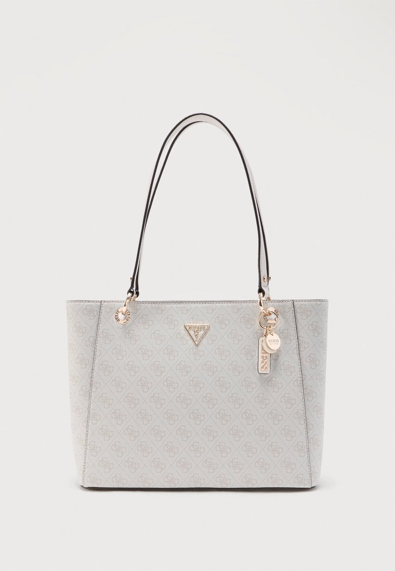 Τσάντα χειρός Guess ανοιχτού γκρι με μοτίβο λογότυπου, εξαρτήματα σε χρυσό τόνο και διπλούς ιμάντες ώμου σε λευκό φόντο.