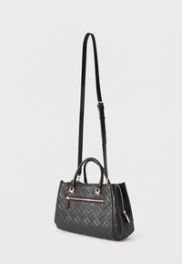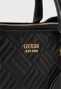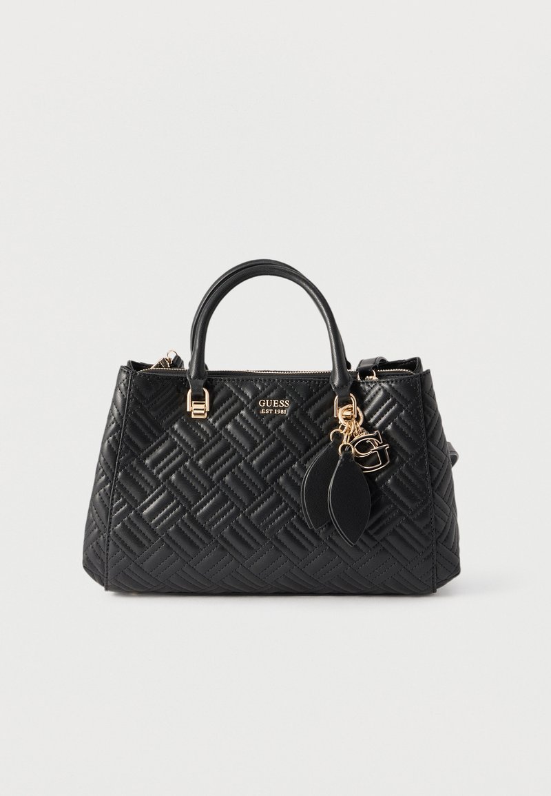 Μαύρη καπιτονέ δερμάτινη τσάντα με διπλές λαβές, χρυσά διακοσμητικά, διακοσμητικό γούρι και λογότυπο "GUESS EST 1981" στο μπροστινό μέρος.