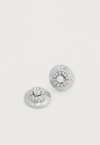 Ασημένια στρογγυλά σκουλαρίκια με καρφίτσα, με διαυγή κεντρική πέτρα περιτριγυρισμένη από μικρότερες πέτρες και χαραγμένο το λογότυπο "GUESS" γύρω από τις άκρες.