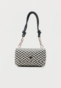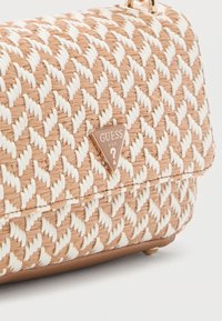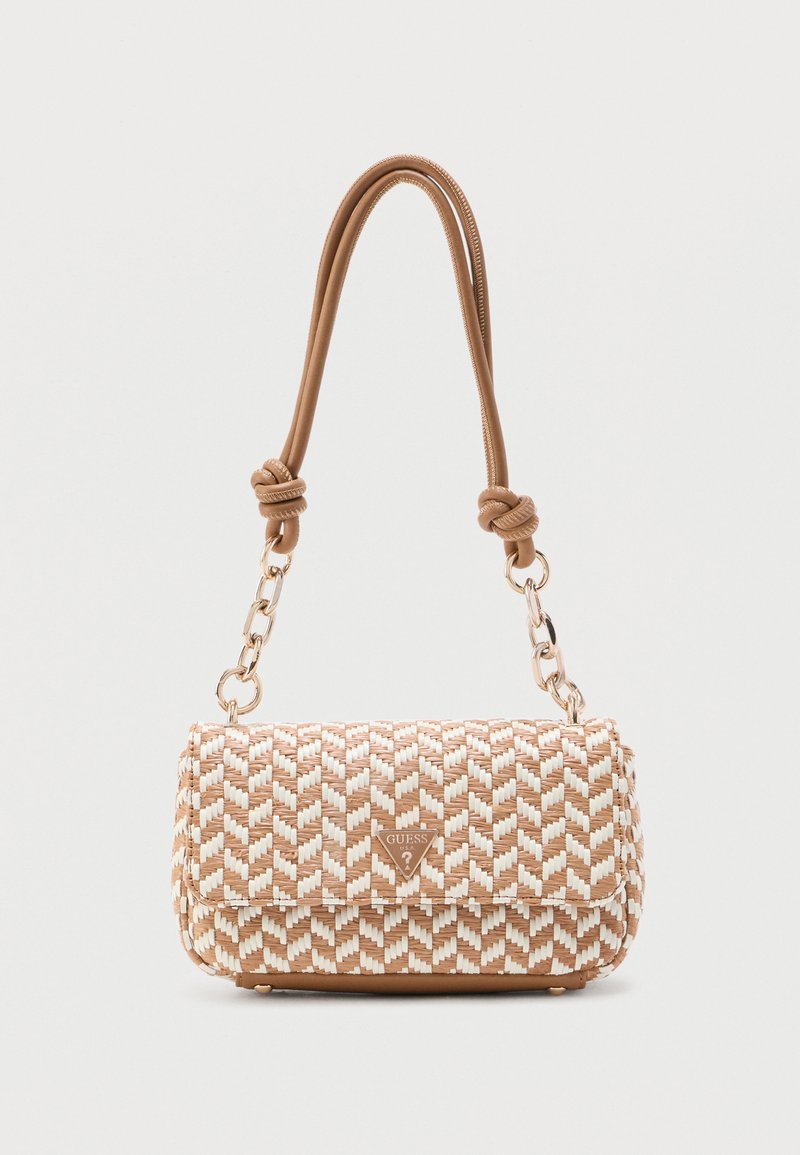 Πλεκτή τσάντα ώμου σε μπεζ και λευκό με υφασμένο σχέδιο, κλείσιμο με καπάκι, χρυσές αλυσίδες διακοσμητικά, δεμένη λουρίδα από ταμπά δέρμα και λογότυπο Guess στο μπροστινό μέρος.