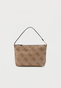 Καφέ tote τσάντα Guess με μοτίβο και ταιριαστή τσάντα με φερμουάρ, με σκούρες καφέ λαβές και κάθετες λευκές ρίγες στο tote.