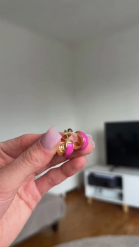 Ζευγάρι μικρών χρυσών κρίκων με έντονο ροζ σμάλτο στο εξωτερικό μισό, εμφανιζόμενα σε λευκό φόντο.