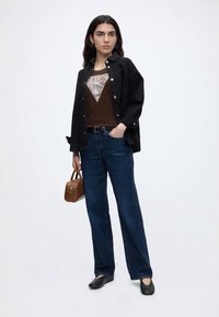 Νεαρή γυναίκα με μακριά σκούρα μαλλιά που φοράει καφέ μπλουζάκι με το λογότυπο Guess και μπλε τζιν, στέκεται μπροστά σε μονόχρωμο ανοιχτό φόντο.