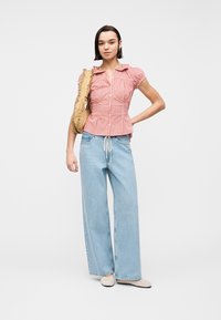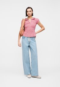 Γυναίκα που φοράει κόκκινο και λευκό καρό μπλουζάκι με κοντά μανίκια και κουμπιά, συνδυασμένο με ανοιχτό μπλε τζιν ψηλόμεσο, μπροστά σε ένα απλό φόντο.