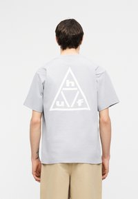 Άτομο με ανοιχτό γκρι κοντομάνικο πουκάμισο με μεγάλο λευκό τρίγωνο λογότυπο που περιέχει τα γράμματα "h," "u," και "f" στην πλάτη, μπεζ παντελόνια.