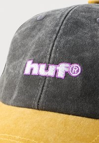 Σκούφος μπέιζμπολ σε σκουρό γκρι και μουσταρδί κίτρινο με το λογότυπο "huf®" κεντημένο σε λευκό και ροζ στην μπροστινή πλευρά, απεικονίζεται σε ανοιχτό φόντο.