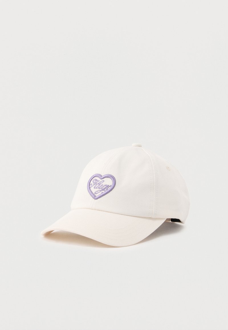 Λευκό καπέλο μπέιζμπολ με μωβ λογότυπο σε σχήμα καρδιάς και καλλιγραφικό κείμενο στο μπροστινό μέρος, εμφανίζεται σε απλό ανοιχτό φόντο.