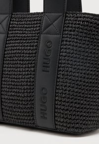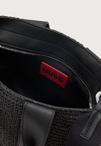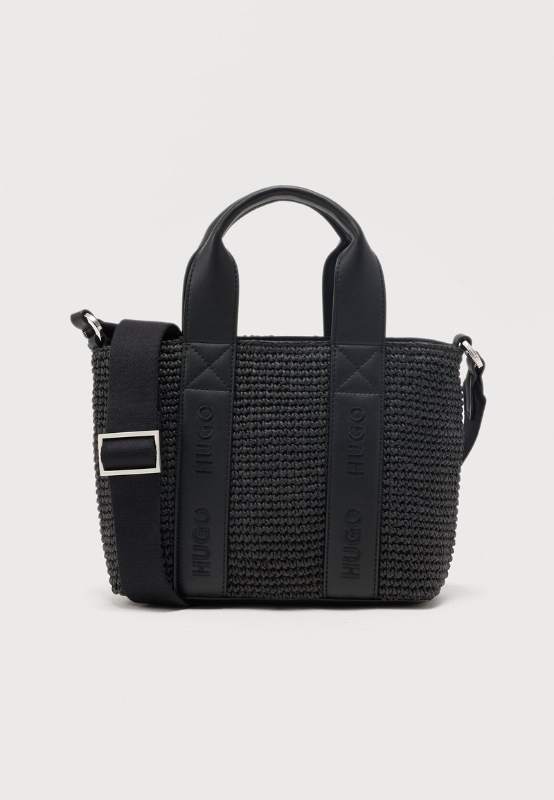 Μαύρη υφασμάτινη τσάντα χειρός με δύο κοντά δερμάτινα χερούλια, ρυθμιζόμενο ιμάντα ώμου και κάθετες δερμάτινες λωρίδες με ανάγλυφο λογότυπο "HUGO".