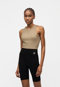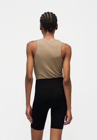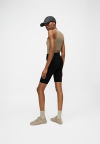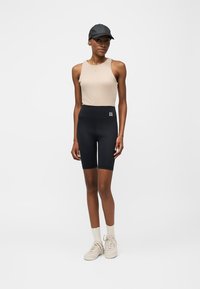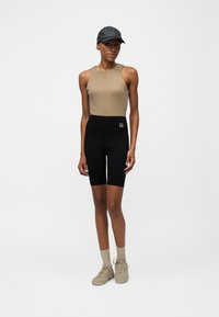 Γυναίκα με πλεξούδες, φορώντας μπεζ αμάνικο τοπ και μαύρο biker σορτς ψηλής μέσης με λογότυπο "HUGO" στη μέση.