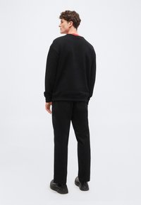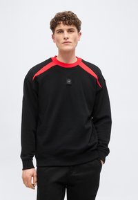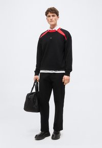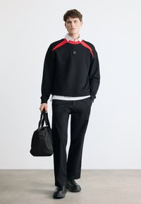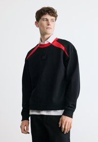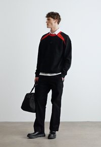 Νέος άνδρας που φοράει μαύρο φούτερ με κόκκινες ρίγες στους ώμους και λευκό πουκάμισο με γιακά, κοιτάζοντας προς τα πλάγια με φόντο απλό φωτεινό σκηνικό.