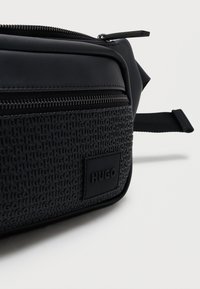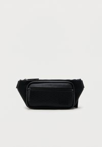 Μαύρο υφασμάτινο τσαντάκι μέσης με μπροστινή τσέπη με φερμουάρ και ρυθμιζόμενους πλαϊνούς ιμάντες σε απλό φωτεινό φόντο.