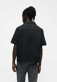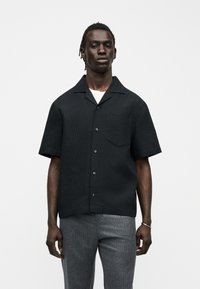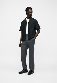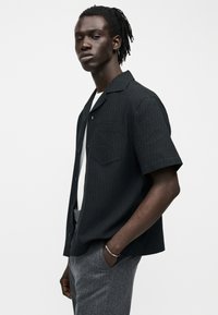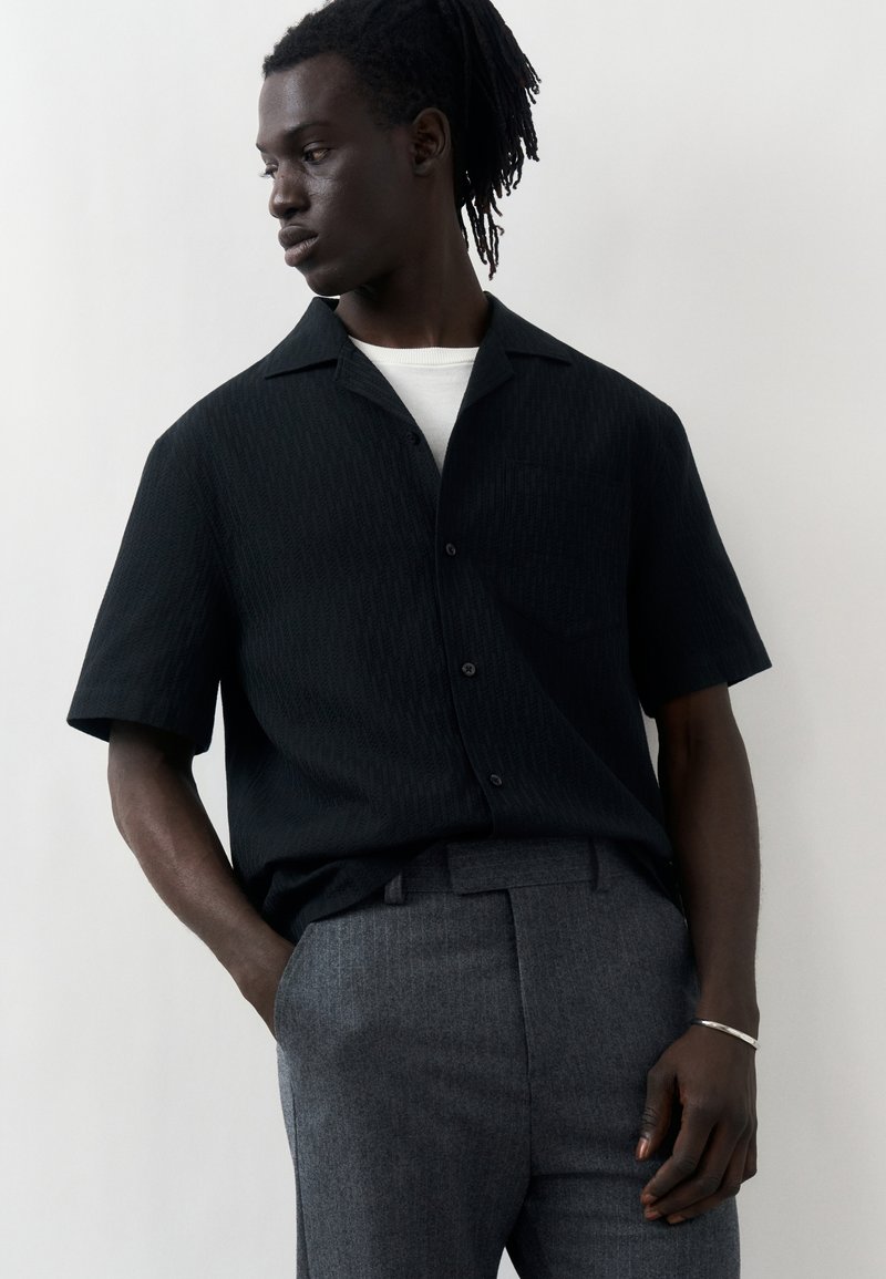Άνδρας με dreadlocks που φοράει μαύρο κοντομάνικο πουκάμισο με κουμπιά πάνω από λευκό μπλουζάκι και γκρι παντελόνι, στέκεται με το ένα χέρι στην τσέπη, κοιτάζοντας αριστερά.