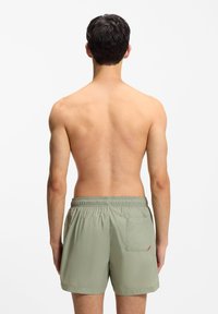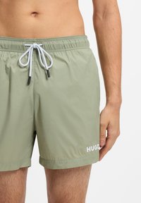 Νεαρός άνδρας με κοντά σκουρόχρωμα μαλλιά στέκεται χωρίς πουκάμισο, με σταυρωμένα χέρια, φορώντας ανοιχτοπράσινα μαγιό με κορδόνι και λογότυπο "HUGO".