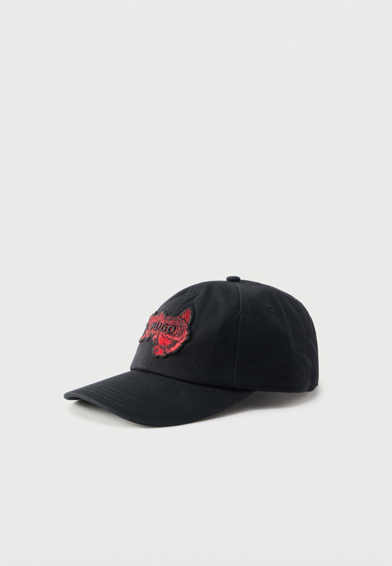 Μαύρο καπέλο μπέιζμπολ με καμπυλωτό γείσο, διακοσμημένο με κόκκινο κεντημένο κεφάλι τίγρης και το κείμενο "HUGO" στην μπροστινή πλευρά.
