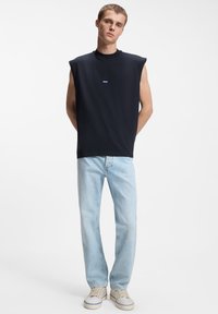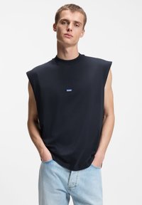 Νέος άνδρας που φοράει μαύρο αμάνικο τοπ με μικρό λογότυπο "HUGO", ανοιχτόχρωμο μπλε τζιν, στέκεται με τα χέρια στις τσέπες μπροστά σε λευκό φόντο.