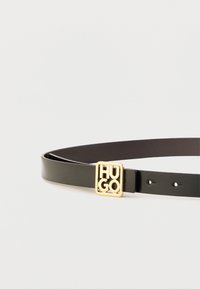Μαύρη δερμάτινη ζώνη τυλιγμένη με τετράγωνη χρυσή αγκράφα, που διαθέτει κομμένα γράμματα που σχηματίζουν τη λέξη "HUGO" σε απλό ανοιχτό φόντο.