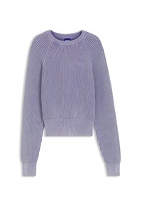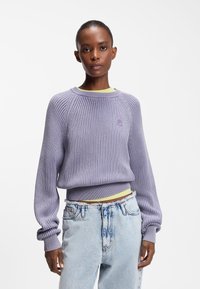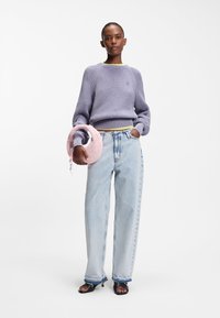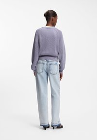 Γυναίκα που φοράει μια πλεκτή πουλόβερ λεβάντας πάνω από ένα αμάνικο μπλουζάκι πράσινου λάιμ και ανοιχτό μπλε ψηλόμεσα τζιν με ξεφτισμένη μέση, στέκεται μπροστά σε λευκό φόντο.