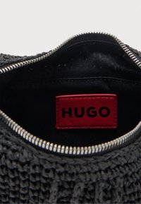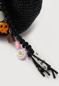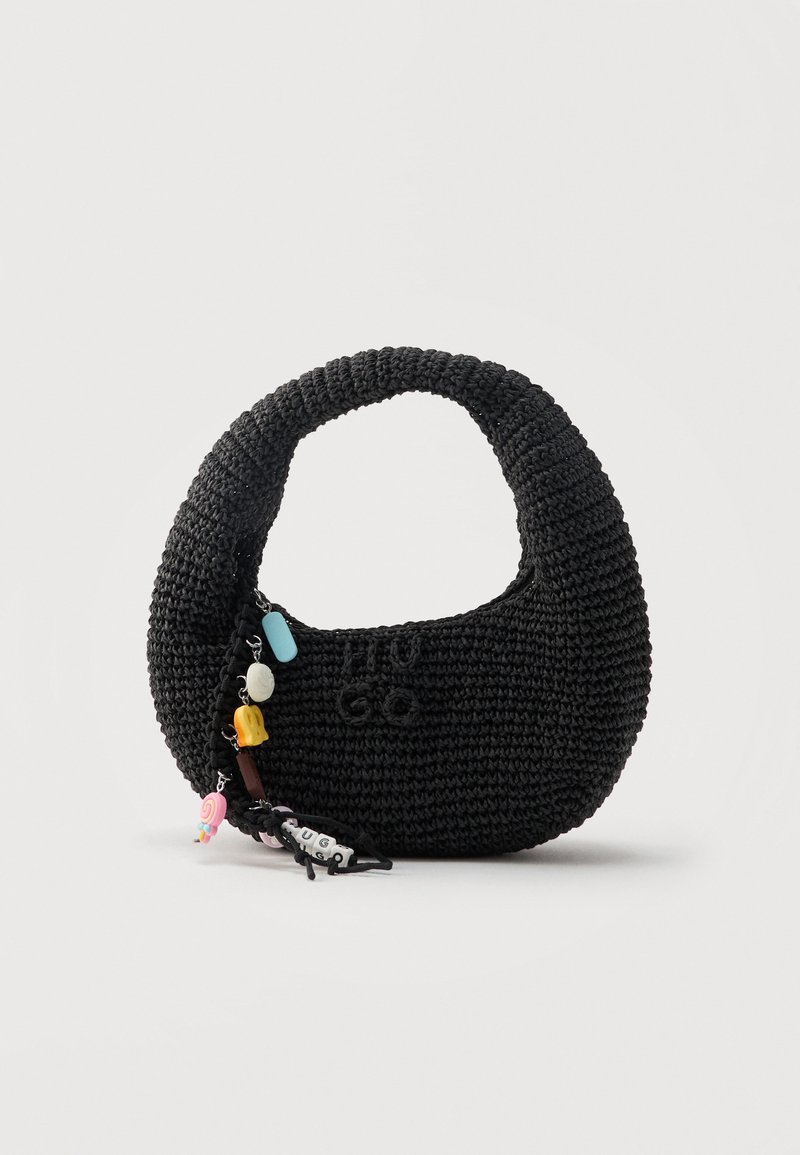 Μαύρη τσάντα από βελονάκι με στρογγυλή λαβή, με το κέντημα "HUGO" στην μπροστινή πλευρά και πολύχρωμο μπρελόκ με χάντρες και γράμματα.