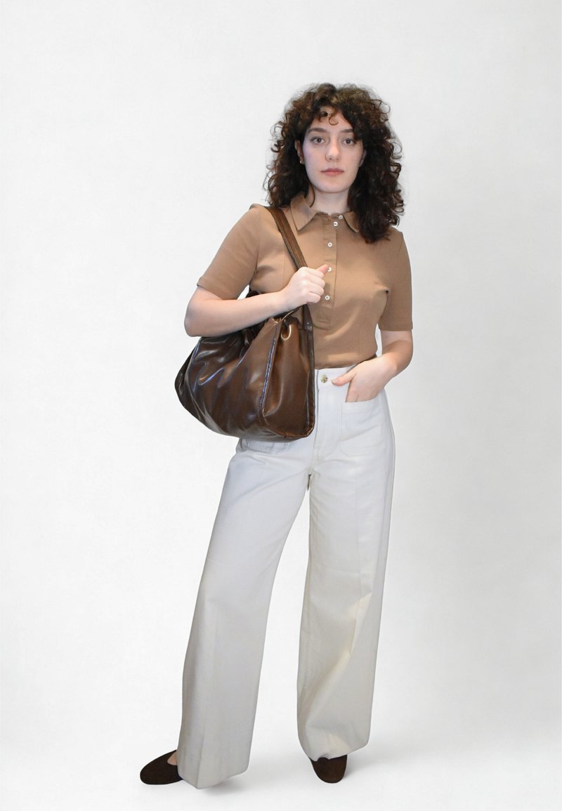 Καφέ δερμάτινη τσάντα χειρός, μπεζ πόλο μπλούζα με κοντά μανίκια, λευκό παντελόνι με φαρδιά πόδια και καφέ επίπεδα παπούτσια. Ομαλές υφές και ουδέτερα χρώματα.