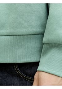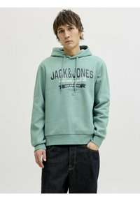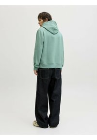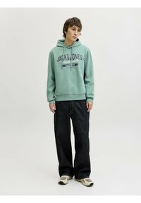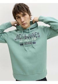 Νέος άνδρας που φοράει μια φούτερ φούτερ Jack & Jones σε μέντα πράσινο χρώμα με κείμενο, στέκεται μπροστά σε απλό ανοιχτό γκρι φόντο, με το ένα χέρι στην τσέπη.