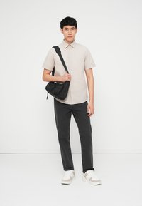 Νεαρός άνδρας όρθιος, φοράει ανοιχτό μπεζ κοντομάνικο πουκάμισο με κουμπιά και σκούρο γκρι παντελόνι, με φόντο απλό λευκό.