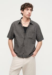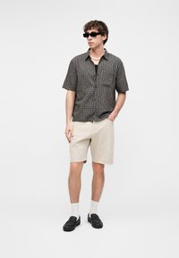 Άνδρας με μπεζ σορτς μέχρι τα γόνατα, λευκές κάλτσες, μαύρα μοκασίνια και μαύρο πουκάμισο, στέκεται μπροστά σε έναν απλό ανοιχτό φόντο.
