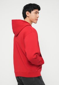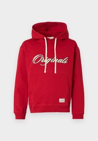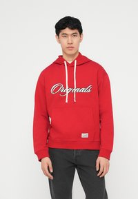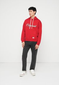 Νέος άνδρας που φοράει κόκκινο φούτερ με κουκούλα με το κείμενο «Originals» και λευκά κορδόνια, σε συνδυασμό με σκούρο γκρι τζιν, στέκεται μπροστά σε λευκό φόντο.