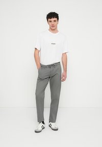 Γκρι ελαφριά παντελόνια με ελαστική μέση με κορδόνι, ίσια κοπή και πλαϊνές τσέπες· συνδυασμένα με λευκά και μαύρα αθλητικά παπούτσια.
