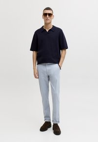 Άνδρας με ανοιχτό μπλε slim-fit παντελόνι με μανσέτες, σκούρα καφέ σουέντ μοκαρίνια, μαύρο βραχιόλι με χάντρες και μπλε σκούρο πουκάμισο.
