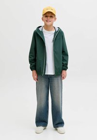 Αγόρι με πράσινο μπουφάν με φερμουάρ, λευκό μπλουζάκι, φαρδιά μπλε τζιν, λευκά αθλητικά παπούτσια και κίτρινο καπέλο, στέκεται μπροστά σε απλό φόντο, χαμογελώντας.
