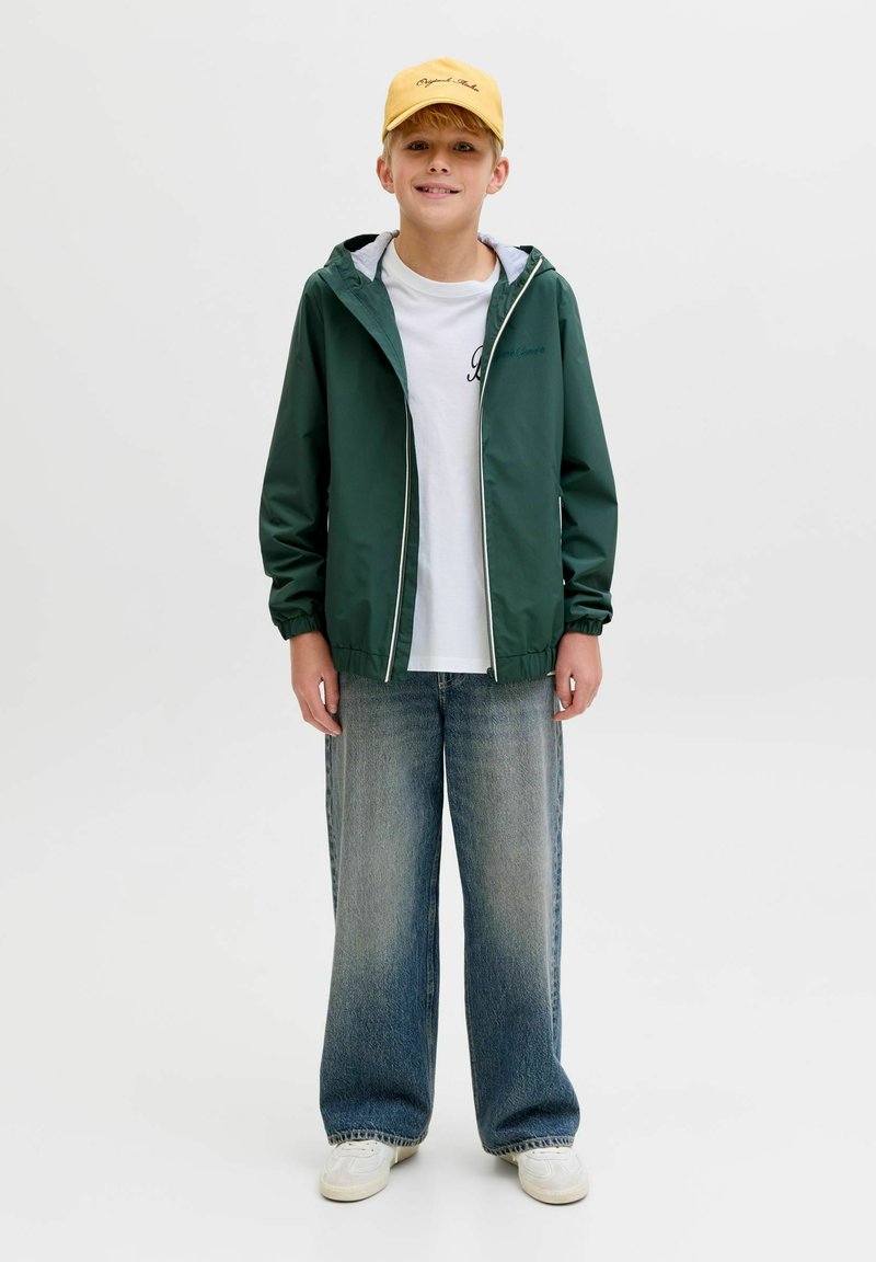 Ένα αγόρι στέκεται φορώντας ένα χακί πράσινο μπουφάν, μπλε σκούρο μπλουζάκι με τύπωμα, φαρδιά μπλε τζιν και γκρι αθλητικά παπούτσια, μπροστά σε απλό λευκό φόντο.