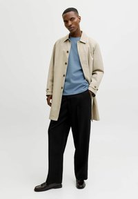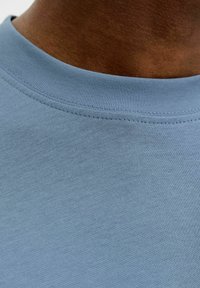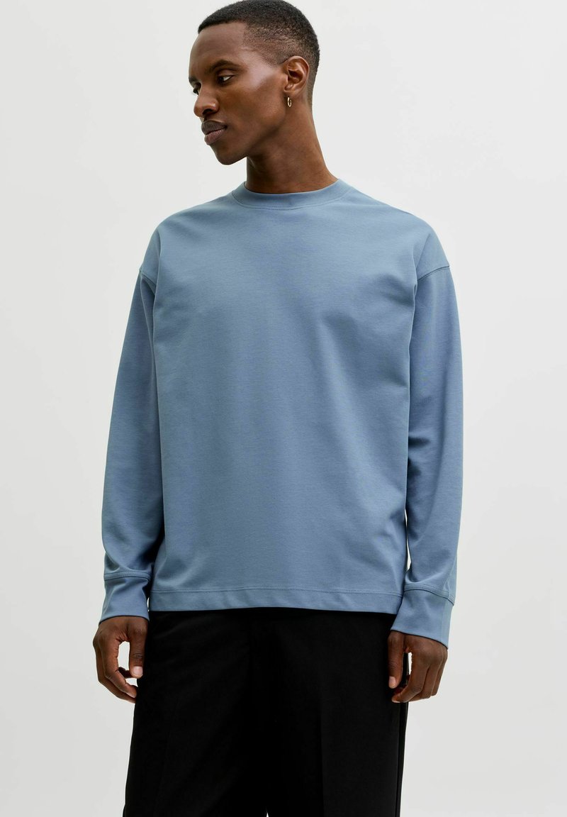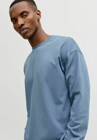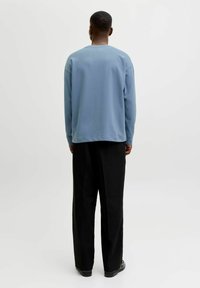 Ανοιχτό μπλε φούτερ με μακριά μανίκια και λαιμόκοψη crew, με λείο ύφασμα και άνετη εφαρμογή, συνδυασμένο με μαύρο παντελόνι.