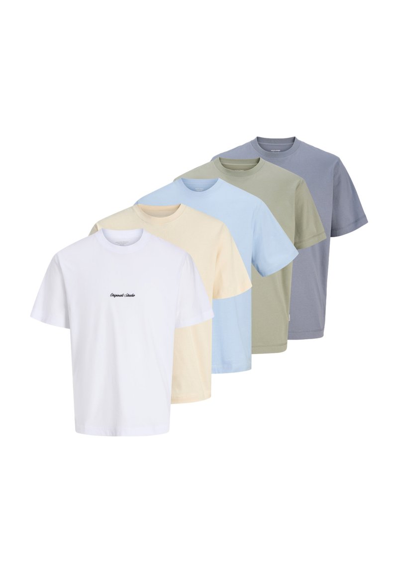 Πέντε κοντομάνικα βαμβακερά μπλουζάκια σε λευκό, παστέλ κίτρινο, ανοιχτό μπλε, ελιά και γκρι. Καθένα διαθέτει στρογγυλή λαιμόκοψη με διακριτική σήμανση.