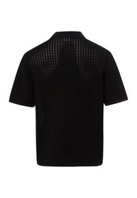 Μαύρο πόλο πουκάμισο με κοντά μανίκια, με μοτίβο δίχτυ πλέγματος και μονόχρωμο γιακά, μανσέτες και τελείωμα, εμφανισμένο σε λευκό φόντο.